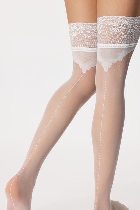 Edle halterlose Strümpfe Wedding in Strumpfnaht-Optik für längere Beine. Mit Zierspitze am Saum.
