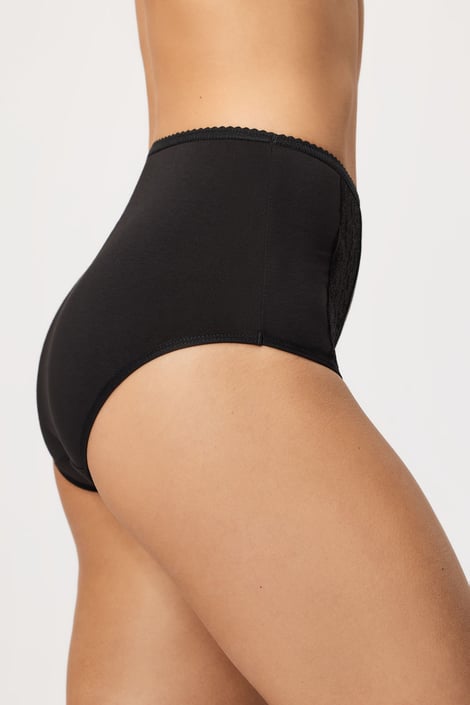 Baumwollslip Bea in klassischem Schnitt mit höherem Bund. Die Vorderseite zieren zwei Streifen aus zarter Spitze, die Rückseite ist glatt. Eleganz und Komfort in einem Wäschestück.